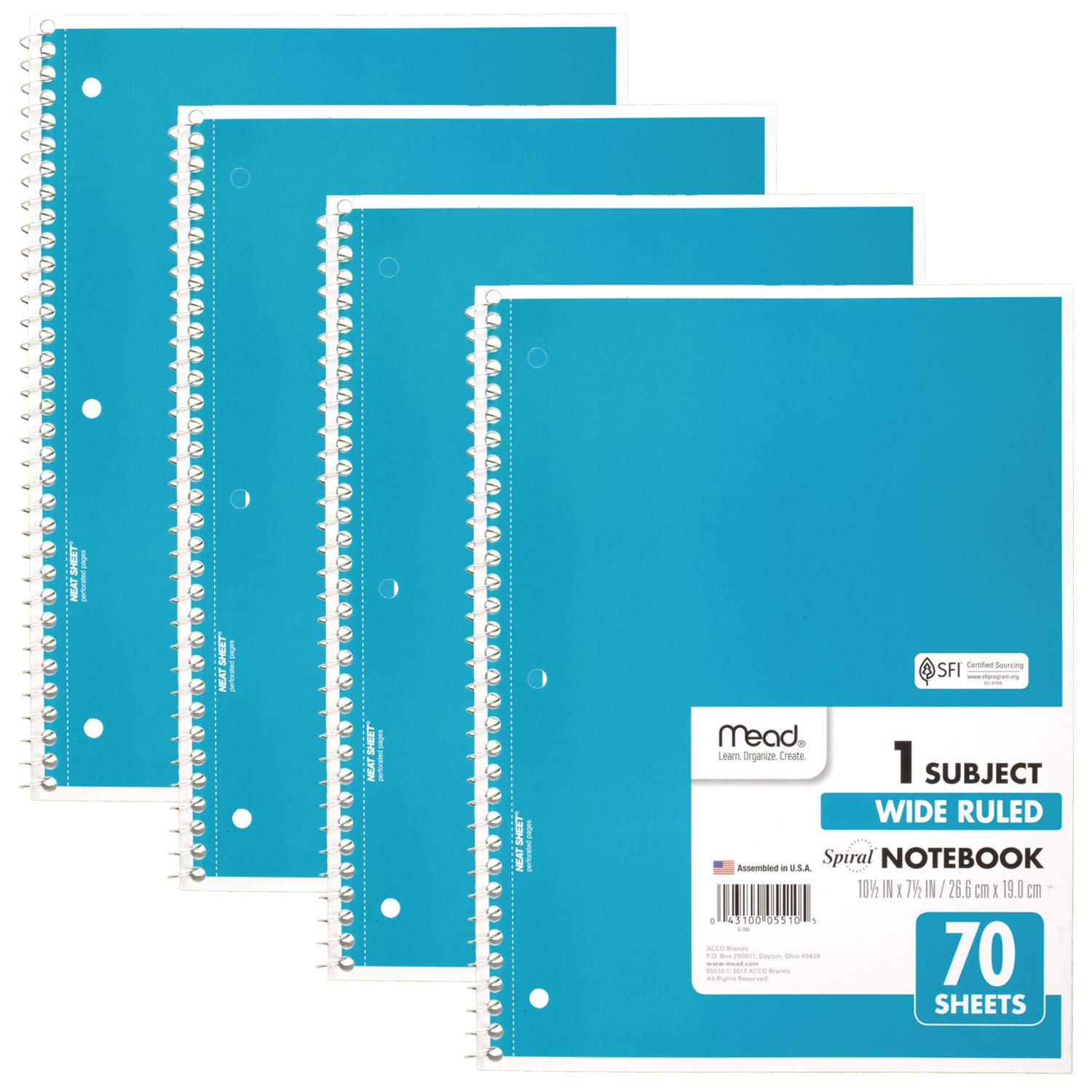 Blue Spiral Notebooks, Wide Ruled, 1 Subject, 70 Sheets, Pack of 4